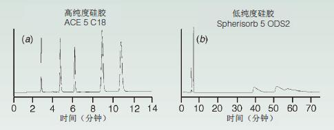 因此,高純度硅膠比較老的硅膠的峰形更好,正如圖3所示分離中的幾種堿基成分那樣。