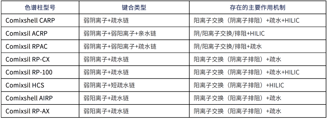 2021年,我們?cè)诨旌献饔茫?/span>mixed-mode)固定相設(shè)計(jì)上繼續(xù)開疆拓土,開發(fā)出了Comixsep系列的三款多種作用力組合的反相固定相;