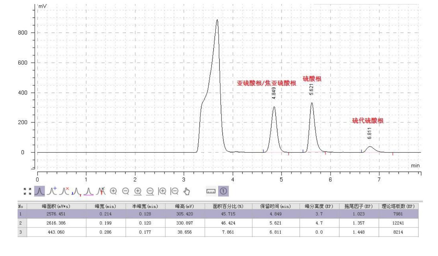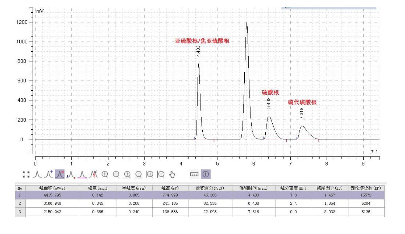 方法說(shuō)明:含硫原子的酸根通常酸性較強(qiáng),單純采用陰離子交換,較難洗脫且拖尾明顯;采用 Comixsil ACRP 的陰/陽(yáng)離子交換/排阻,可有效減弱保留,以此來(lái)改善峰型及保留;亞硫酸根及焦亞硫酸根等具有較強(qiáng)的還原性,在空氣中易氧化為硫酸根,從而影響定量的準(zhǔn)確性,在溶劑中加入 0.1%甲醛溶液作為抗氧化劑, 可有效抑制酸根的氧化,以此來(lái)滿足定量需求。