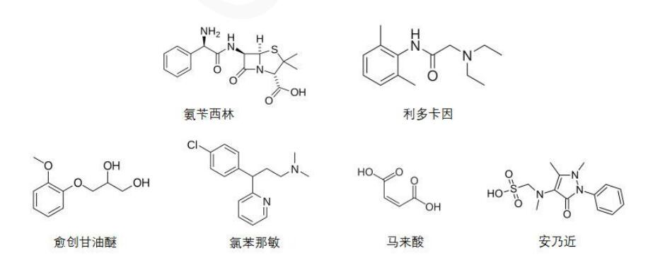 App ID: FLM-C240008 Comixsil RP-AX 同時分析鎮痛類藥物制劑安乃近、利多卡因、愈創甘油醚、馬來酸氯苯那敏、氨芐西林 色譜柱: Comixsil RP-AX 3μm 150*4.6mm(貨號:FMF-AXR3-EONU) 流動相: 時間 水 乙腈 200mM 甲酸銨(pH 3.4) 0 55 10 35 10 25 40 35 10.01 55 10 35 20 55 10 35 流速:1.0 mL/min 檢測波長:255nm 柱溫:25℃ 樣品濃度:N/A 進樣量:N/A 結構式: