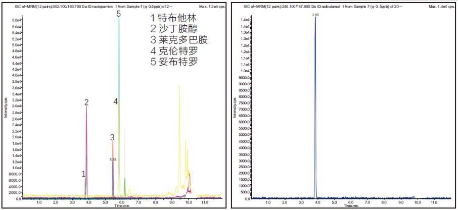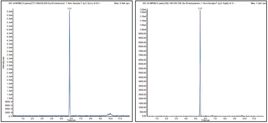 2、添加水平為 0.5μg/kg 豬肉基質(zhì)中β-受體激動(dòng)劑檢測(cè)色譜圖