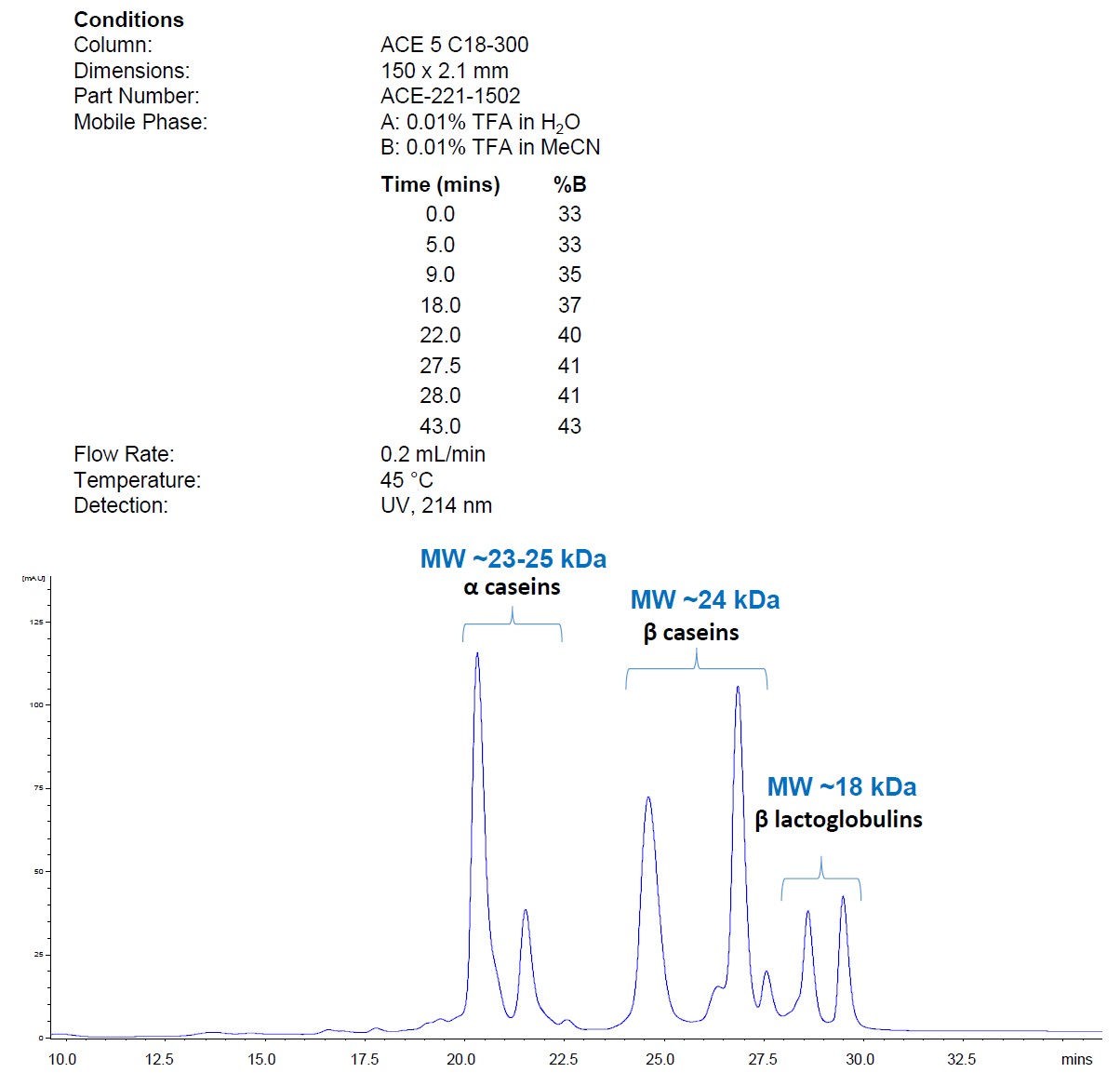 反相HPLC靈敏、通用性強(qiáng),能夠分離結(jié)構(gòu)近乎相同的蛋白質(zhì)。ACE反相色譜柱采用含極低金屬離子雜質(zhì)的超惰性硅膠制成,使用極低濃度離子對試劑依然可以維持良好的峰形。